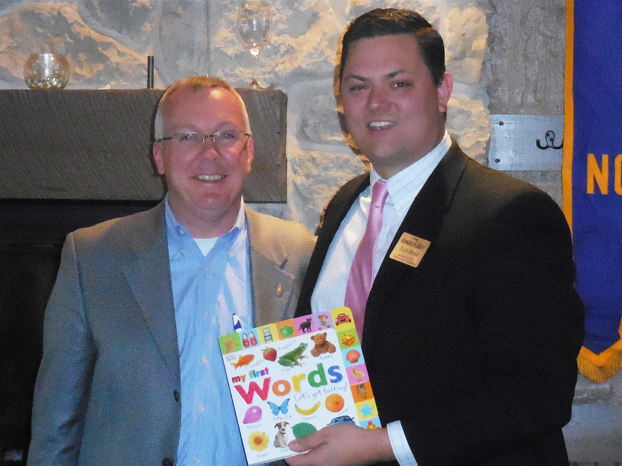 Zach Blend holds a book donated in his honor to the Child Development Center after providing an fascinating talk on how our club and Goshen Valley Ranch is changing the lives of boys in the foster care system.